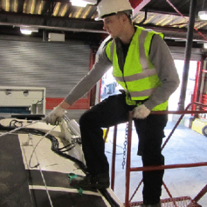 The operative wears a comfortable padded Bi-LINE Work Positioning Belt with a simple snap fix buckle and friction adjusted webbing strap. The ‘stowed’ lanyard location is identified by and access sticker on the side of the vehicle. The operative would locate the access ladder / platform adjacent to this sticker. At waist height to the vehicle roof, the operative can reach the lanyard and release it from the stowage anchor. The Lanyard is then used as a third point of contact and restraint so the operative can pull themselves onto the roof. In the middle of the Lanyard is a Safety Swivel Hook trapped between two Stoppers, the hook is immediately connected to a sliding D Shackle on the operatives belt. The operative is now secured but has both free.