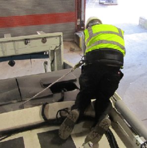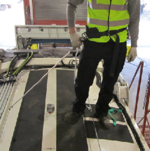 Once connected, the operative has hands free access to all of the main body, the lanyard simply slides along the restraint line as the operative progresses along the roof area. In the majority of cases the lanyard provides access to the whole roof area, however on some vehicles require a second fixed lanyard that provides access to the hopper hydraulics and electrics. The length of the lanyard from its attachment to the restraint line to the hook is less than the width of the vehicle preventing falls from the sides. Stoppers fitted to the restraint lines limit the access at the end of the vehicle.